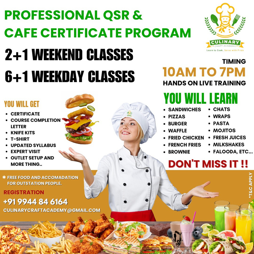 Elevate your culinary career with Coimbatore's top Cafe and QSR training at Culinary Craft Academy. Gain hands-on experience in crafting delicious burgers, sandwiches, pizzas, coffee, and more, under the guidance of industry experts. Our comprehensive programs are designed to equip you with the skills needed to excel in the fast-paced world of Quick Service Restaurants and Cafés. Join us and turn your passion into a profession!